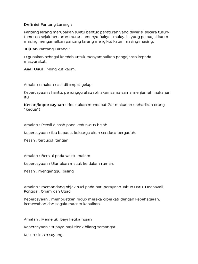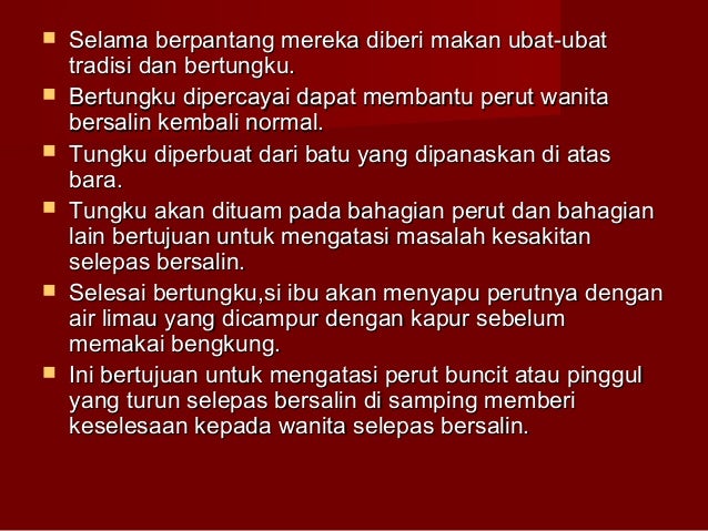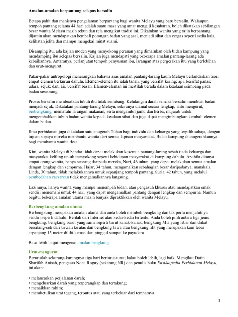 Amalan pantang larang selepas bersalin mengikut kaum. Pengenalan kepada rawatan bersalin mengikut amalan tradisional melayu masalah ibu ketika berpantang rawatan dan penjagaan bayi pengenalan kepada herba dan rempah ratus pemakanan dalam pantang pantang larang petua hamil dan persediaan kelahiran cara perawatan penjagaan bayi masalah keibuan dalam pantang etika sebagai juruterapi postanal urutan selepas bersalin titik. Amalan memakai bengkung masih dilakukan oleh kebanyakan wanita melayu selepas mereka bersalin. Amalan berbengkung biasanya dilakukan dalam masa pantang selama kira kira 44 hari. Ada beberapa pantang larang yang menjadi amalan supaya proses pemulihan itu lebih berkesan.