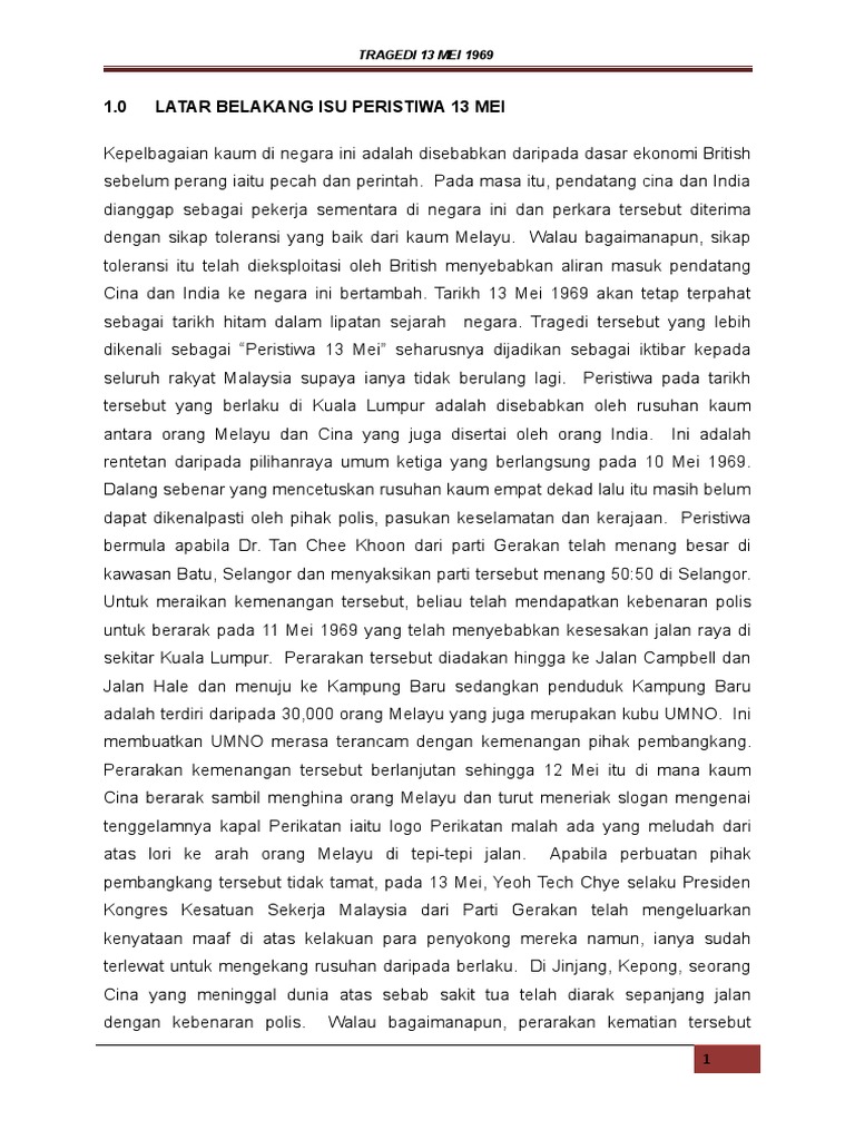 Assignment peristiwa 13 mei 1969. Siri peristiwa yang berlaku sewaktu rusuhan 13 mei telah didokumen oleh dr kua kia soong dalam bukunya bertajuk may 13. Kesimpulan perpaduan kaum adalah matlamat penting yang ingin dicapai oleh semua negara termasuk malaysia. Tragedi ini telah meragut nyawa serta harta benda dan mempunyai kaitan yang rapat dengan pilihan raya umum 10 mei 1969 merupakan satu titik hitam dalam sejarah negara malaysia. Peristiwa 13 mei 1969 thursday 24 september 2015.