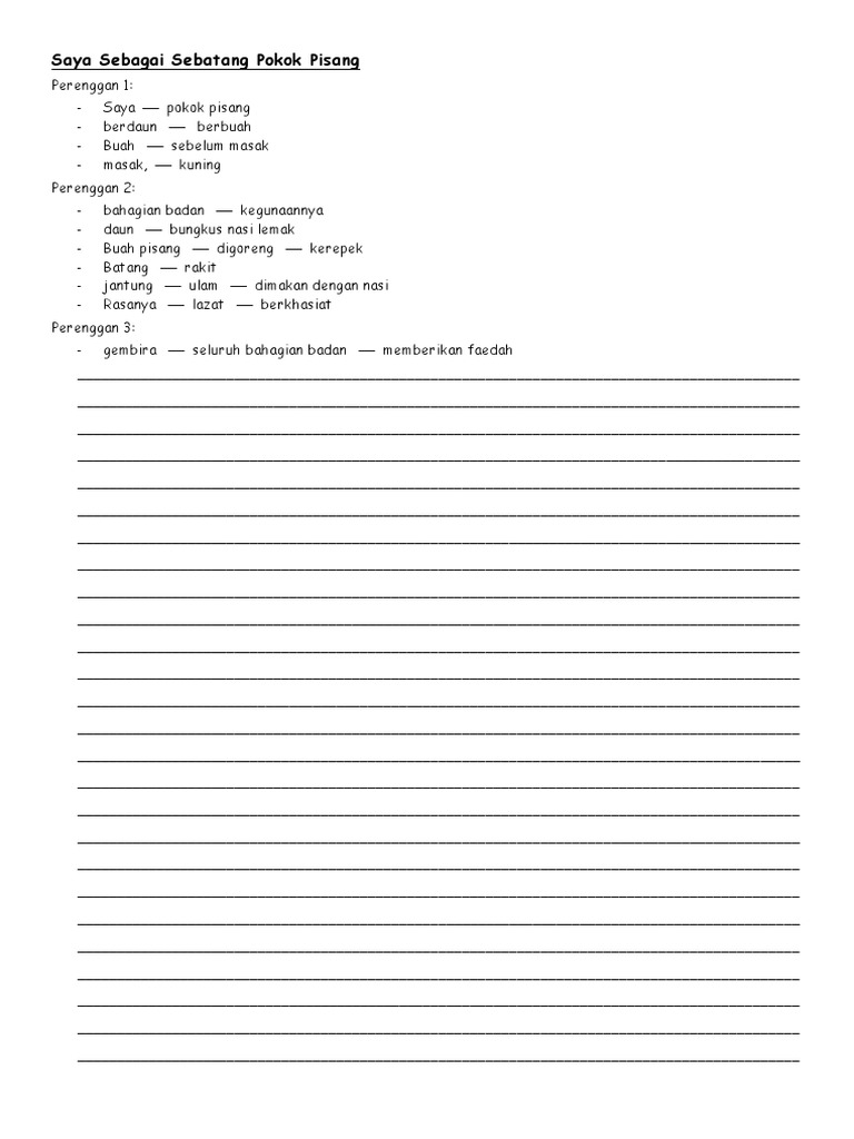 Autobiografi aku sebatang pokok pisang. Aku dipagar supaya tidak dimakan oleh kambing dan lembu. Cara menulis karangan jenis riwayat ini ialah murid mesti menganggap diri mereka seperti yang dikehendaki oleh tajuk karangan. Daunku panjang dan berwarna hijau. Aku dibaja sebulan sekali supaya cepat membesar.