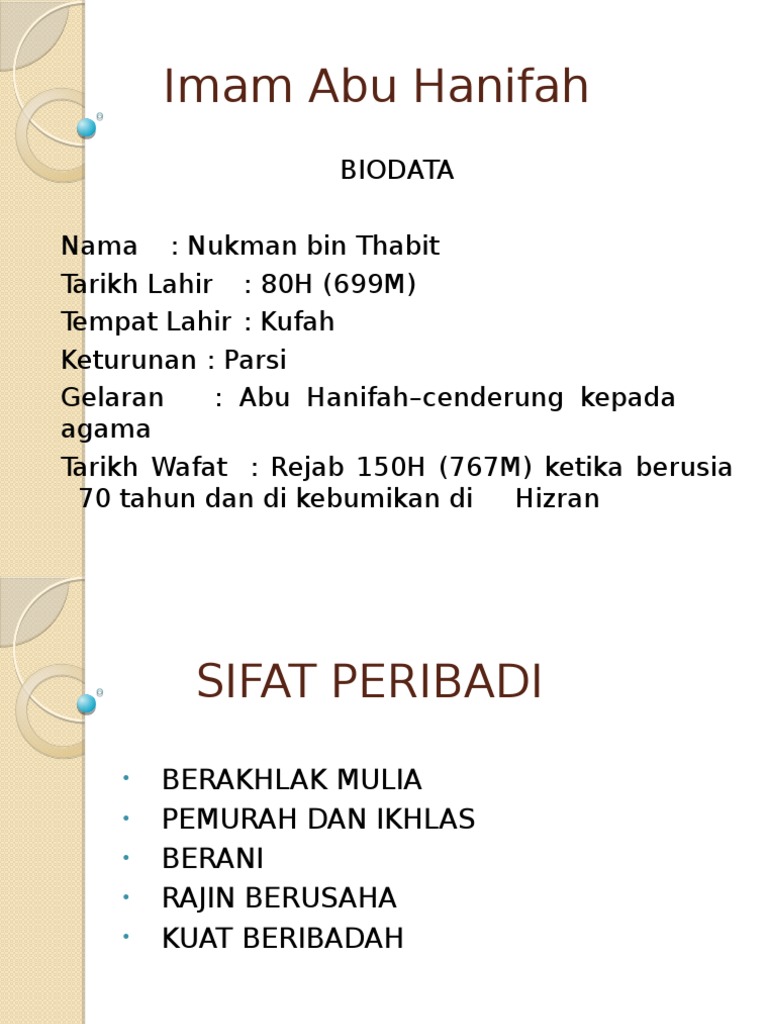 Abu hanifah ابو حنيفه atau nama sebenar beliau nukman bin thabit نعمان ن ثابت dilahirkan pada 80 hijrah bersamaan 699 masihi dalam sebuah kampung bernama anbar di kufah iraq ketika zaman pemerintahan khalifah abdul malik bin marwan beliau berasal dari keturunan parsi dan merupakan ulama terkenal islam yang mengasaskan mazhab hanafi. Biografi imam abu hanifah. Wink 28 juni 2016 3. Konon ada sekitar 50 ribu orang yang ikut mensalati abu hanifah termasuk khalifah abu ja far.