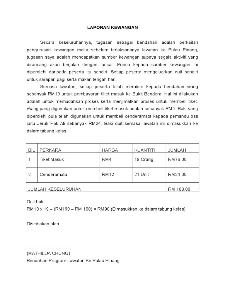 Contoh laporan kewangan bendahari program. Laporan program keseluruhan kumpul dan derma tarikh 10 mei 2014 tempat maahad tahfiz anak yatim darul fuqaha. 1 misi jabatan meneraju pengurusan kewangan yang cemerlang dan penganggihan sumber hasil. Laporan tahunan 2014 pejabat kewangan dan perbendaharaan negeri negeri sembilan darul khusus. Secara keseluruhanya tugasan sebagai bendahari adalah berkaitan dengan pengurusan kewangan maka sebelum terlaksananya program big tugasan saya adalah mendapatkan sumber kewangan dan merancang anggaran perbelanjaan supaya segala aktiviti yang dirancang akan berjalan dengan lancar.