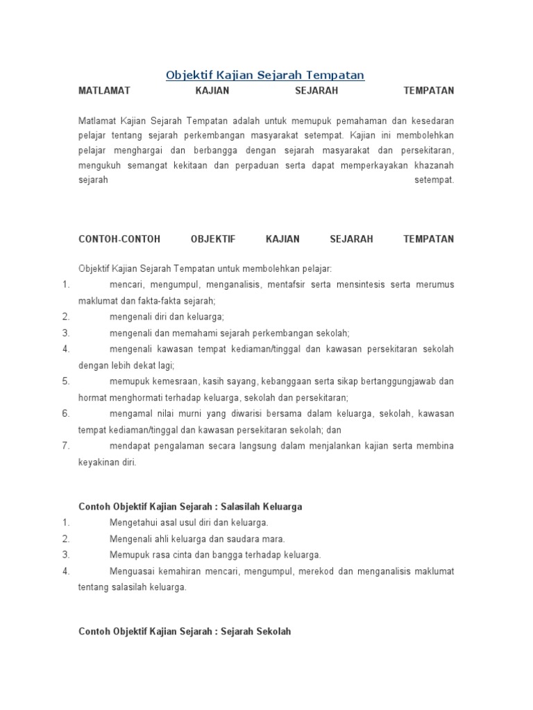Contoh objektif kajian sejarah. Kumpulan sasaran selaraskan dengan yang terdapat dalam proposal kertas cadangan kajian 11. Contoh objektif kajian sejarah pt3 2019. Sejarah ekonomi adalah cabang sejarah yang paling sesuai dengan teknik teknik kuantitatif sehingga dianggap sebagai sains atau ilmu sosial. Objektif kajian tugasan sejarah pt3 2020 melalui kajian ini saya dapat memenuhi objektif kajian seperti berikut.