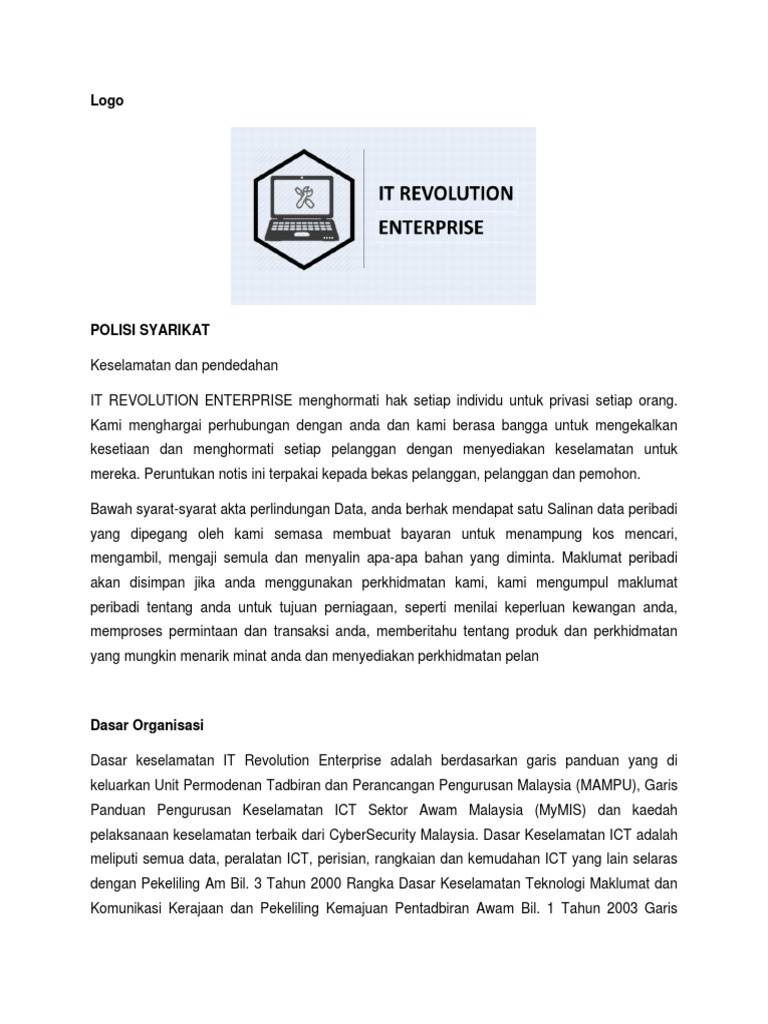 Contoh polisi syarikat perniagaan. Zm enterprise oleh kerana syarikat kami merupakan syarikat yang bermodal kecil maka setiap pekongsi akan mengeluarkan wang simpanan sendiri atau bantuan ahli keluarga untuk memulakan perniagaan ini. Polisi keselamatan syarikat syarikat micro tech solution enterprise berikrar untuk menyediakan suasana yang sihat dan selamat untuk kesemua kakitangan kontraktor dan pelwat ke tempat syarikat beroperasi. Mengawal selia semua ancaman bahaya. Polisi pengendalian perniagaan kami diterima pakai oleh lembaga pengarah kami.