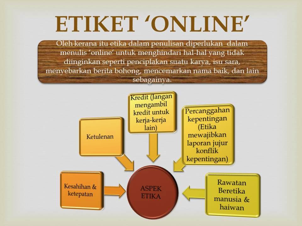 Assalamualaikum warahmatullah dan salam sejahtera blog ini diwujudkan bertitik tolak daripada keperluan para pelajar untuk mendapatkan maklumat tambahan untuk kursus zzzt 2213 bentuk bentuk penulisan dan zzzt 2243 kemahiran menulis di pusat pengajian umum universiti kebangsaan malaysia tidak banyak perkara dapat dibincangkan secara telus dan menyeluruh di dalam dewan kuliah. Sebab berlaku pelanggaran etika etiket online keinginan menjadi penulis dengan cepat penyalahgunaan teknologi penguatkuasaan undang undang yang longgar tidak faham apa yang dikatakan pelanggaran etika faktor bahasa penggunaan status dan pengaruh isu isu etika dalam penulisan. Sebagai contoh penulisan harus menyenaraikan rujukan mereka di bahagian belakang penulisan mengikut sistem apa atau sebagainya. Kata pembuka dan penutup sesuai proporsi mengikuti penulisan sebagai tulisan ilmiah.