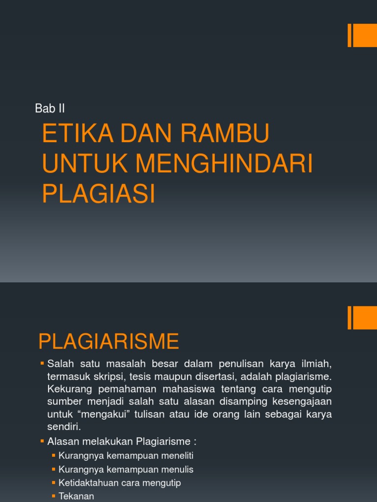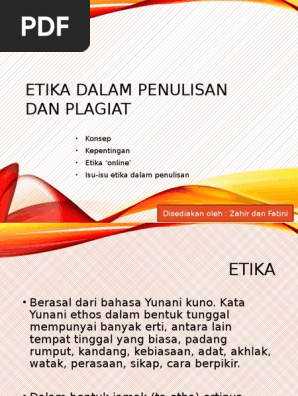 Etika dalam penulisan dan plagiat. Untuk mencegah dan mengatasi tindakan plagiat pemerintah melalui peraturan menteri pendidikan ri no. Plagiat dan etika dalam penulisan november 19 2015 chinthyasianturi plagiarisme atau lebih biasa disebut plagiat merupakan sebuah tindakan dimana tejadinya penjiplakan pengambilan karangan pendapat atau sebagainya dari orang lain dan menjadikan kaarangan tersebut seakan akan milik sendiri. Menulis nota kaki tanpa tanda kutip. Antara kepentingan etika dalam penulisan dan plagiat ialah dalam penulisan ilmiah penulis perlu jujur menyatakan rujukan terhadap bahan atau idea yang diambil daripada orang lain.