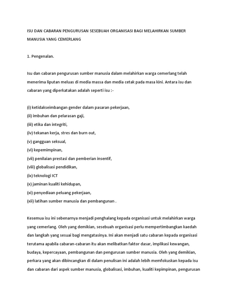 Berdasarkan dapatan dapatan kajian lepas terdapat lebih daripada 40 isu utama di dalam pengurusan sumber manusia seperti isu budaya seeta dan uday b 2016 isu pengambilan pekerja seeta. Tanpa pengurusan sumber manusia sesebuah organisasi akan cenderung menghadapi pelbagai masalah sama ada melibatkan urusan dalaman dan luaran sesebuah organisasi. Itu cabaran utama pengurusan sumber manusia adalah untuk mewujudkan satu sistem pengurusan sumber manusia dengan ciri futuristik dan dinamik untuk menangani perubahan persekitaran masa kini dan masa hadapan. Jurnai pengurusan 14 1 1995 119 133 119 pengurusan sumber manusia strategik beberapa isu penyelidikan rozhan othman abstrak konsep pengurusan sumber manusia menyaran satu pendekatan baru dalam.
