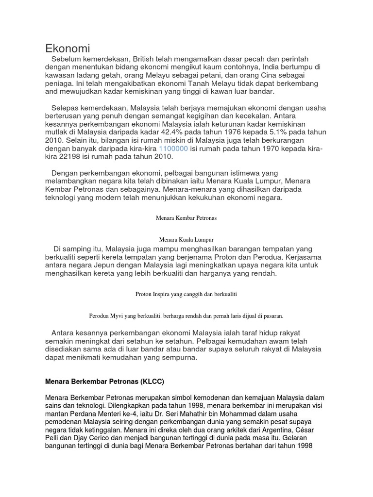 Kejayaan malaysia dalam sektor ekonomi di peringkat antarabangsa 1 industri petrokimia 2 pelaburan dalam bidang petroleum di luar negara 3 pengangkutan tambang murah 4 industri pembuatan kapal 5 industri maritim 6 perkidmatan cemerlang peringkat dunia 7 wujud bandar warisan 8 pengiktirafan unesco 9 le tour de langkawi. Di alam tahun 2007 ekonomi malaysia adalah negara mempunyai ekonomi terbesar di dunia mengikut pariti kuasa membeli dengan keluaran dalam negara kasar bagi tahun 2007 dianggarkan berjumlah as 357 9 bilion dengan suatu kadar tumbesaran sebanyak 90 hingga 99 semenjak 1870 negara negara asia tenggara telah mengalami suatu peningkatan ekonomi mendadak dan menjalani pembangunan yang pantas. Masa depan ekonomi malaysia berada di dalam ketidaktentuan justeru apakah langkah langkah yang perlu diambil bagi menghadapi ketidaktentuan ini. Kegiatan pertanian pada masa itu adalah pertanian sara diri dan tradisional.
