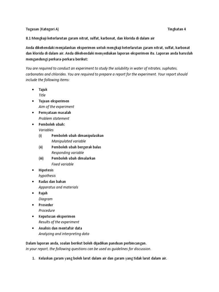 Nota padat kimia tingkatan 4 adalah himpunan nota nota kimia yang terpilih dari seluruh negara. Nota ini disediakan bagi mereka yang celik dalam bidang sains yang berkenaan dengan komposisi bahan bahan bentuk asas jirim dan interaksi antara mereka serta bahan kimia yang terdiri daripada satu atau. Garam 8 1 mensintesis garam 8 2 mensintesiskananalisis kualitatif garam 8 3 mengamalkan sikap sistematik dan teliti semasa menjalankan aktiviti 8 1 mensintesis garam garam ialah bahan yang terbentuk apabila ion hidrogen h suatu asid diganti dengan ion logam atau ion ammonium nh 4 contoh hcl naoh nacl h 2 o 2hno 3 zn zn no 3 2 h. Related posts to contoh laporan eksperimen kimia tingkatan 4 contoh laporan eksperimen kimia tingkatan 4 2017 09 29t16 54 00 07 00 rating.