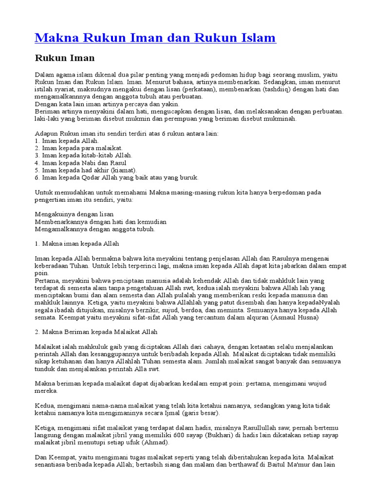 Iman dalam islam merupakan hal yang penting. Semoga dengan mengetahui makna dan kandungan dari rukun islam dan rukun iman ini dapat meningkatkan dan menguatkan keimanan kita terhadap allah swt. Didalam ajaran agama islam terdapat dua pilar penting yang menjadi pedoman hidup bagi seorang muslim yaitu rukun iman dan rukun islam. Rukun iman dalam agama islam dikenal dua pilar penting yang menjadi pedoman hidup bagi seorang muslim yaitu rukun iman dan rukun islam.