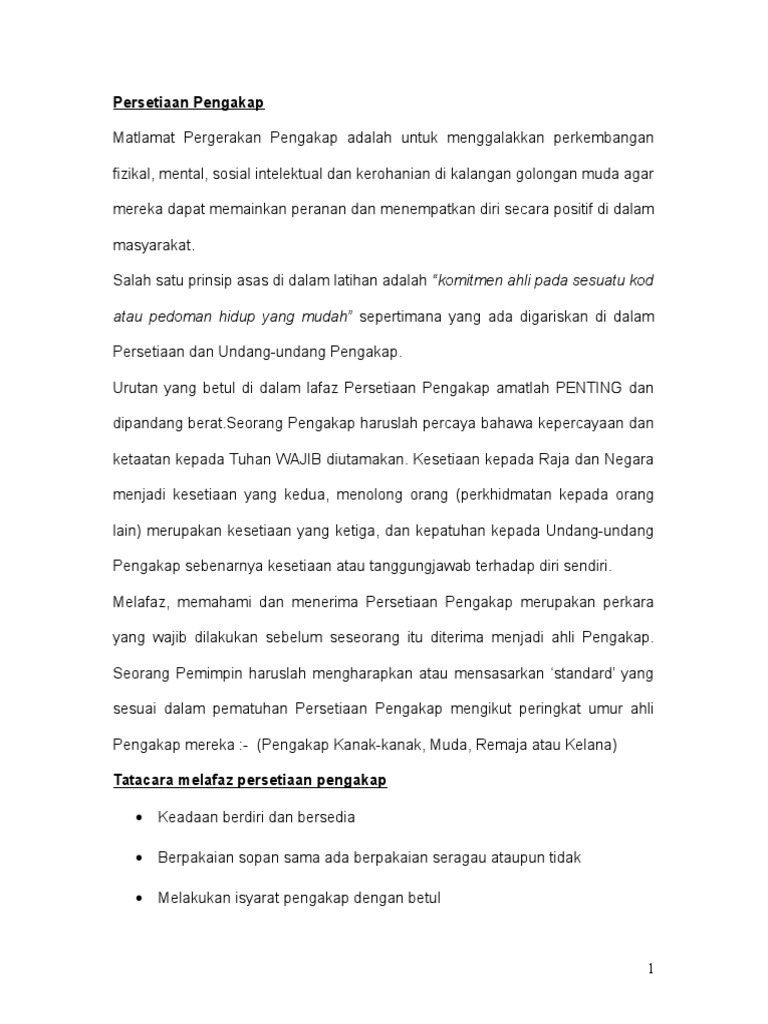 Maksud undang undang pengakap. Manakala hasil dari pertautan ibu jari dan jari kelingking bermaksud persaudaraan pengakap tanpa mengira pangkat darjah maupun keturunan. 2 taat pengakap adalah seorang yang taat kepada tuhan raja negara pemimpin pemimpin. Pengakap adalah seorang yang taat setia kepada seri paduka baginda yang di pertuan agong dan raja raja pemimpin pemimpin pengakapnya ibu bapanya majikannya serta orang orang di bawahnya. Hati kalbu jiwa mental fikiran dan.