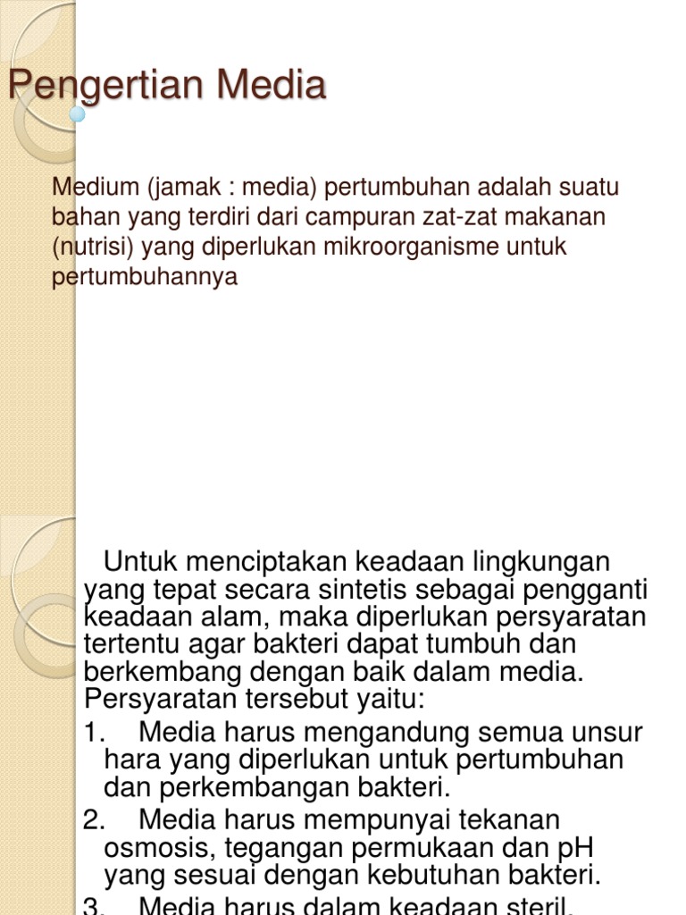 Medium yang digunakan untuk menumbuhkan dan mengembangbiakkan mikroorganisme tersebut harus sesuai susunanya dengan kebutuhan jenis jenis mikroorganisme yang bersangkutan.