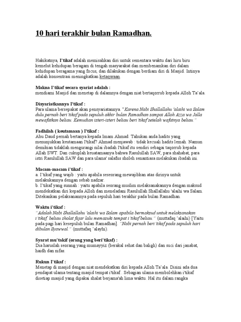 Bincangsyariah com sepuluh hari terakhir bulan ramadan adalah waktu diperkirakan lailatul qadar akan terjadi. Di dalam ayat suci al qur an al baqarah 187 dijelaskan bahwasanya i tikaf ini dilaksanakan di masjid. Seseorang yang berniat beri tikaf tapi ia tidak berada di masjid maka itu bukan i tikaf. Itu menjadikan dia wajib melakukan i tikaf dan dia niatkan aku niat i tikaf yang di nazarkan.