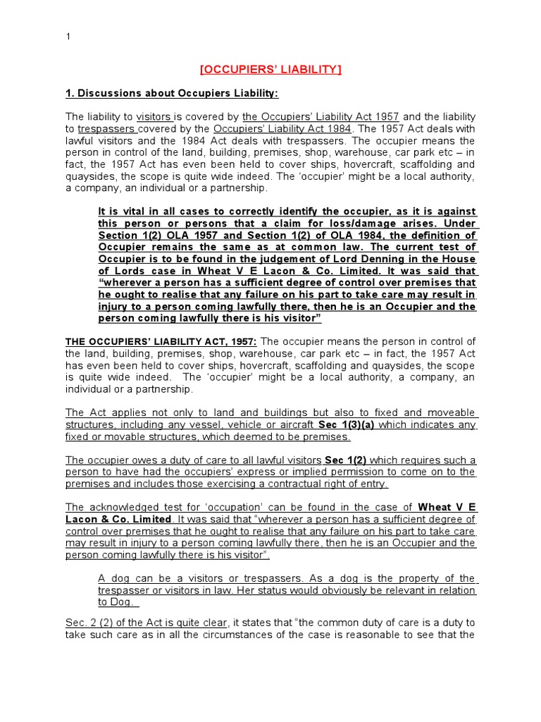 As the 1957 act was not concerned with trespassers the 1984 was enacted to govern the duty of occupier to trespassers. An act to amend the law of england and wales as to the liability of occupiers and others for injury or damage resulting to persons or goods lawfully on any land or other property from dangers due to the state of the property or to things done or omitted to be done there to make provision as to the operation in relation to the. The occupiers liability act 1957 imposes a common duty of care on occupiers to lawful visitors. The 1957 act is mainly concerned with lawful visitors and provides that all lawful entrants are owed the same common duty of care.