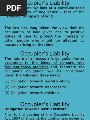 Meaning of occupier 2. All others are covered by the occupiers liability act 1984 discussed below there are thus three key definitions which are relevant to applying the act. Civil appeal no 12 46 of 1995 high court pulau pinang lawyers jagdeep singh deo karpal singh with him karpal singh co for the appellant. The section begins by defining an occupiers liability before introducing the occupiers liability act 1957.