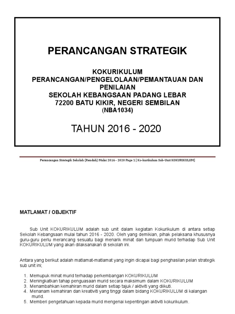 Pelan strategik kokurikulum sekolah rendah 2016. Bidang ko kurikulum 2016 2020 627 2 4 meningkatkan kemudahan infrstruktur dan peralatan bagi memudahkan aktiviti kokurikulum dijalankan tanpa halangan. All materials on our website are shared by users. Perancangan strategik dalam tempoh 2016 2018. Home uncategorized pelan strategik unit kokurikulum 2016.