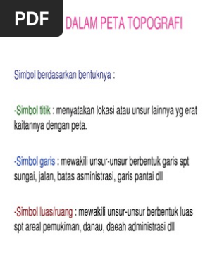 Oleh karena itulah jika kita bisa membaca peta topografi kita bisa mengetahui di mana bagian terendah dari tanah serta puncaknya. Disamping tinggi dan rendahnya pada permukaan dan dari pandangan datar relief juga meliputi pola saluran parit sungai lembah danau rawa dan juga tepi laut serta adakalanya pada beberapa jenis peta ini telah ditunjukkan juga vegetasi dan juga. Simpan simpan simbol dalam peta topografi untuk nanti 0 0 mendukung tandai dokumen ini sebagai bermanfaat 1 1 menolak tandai dokumen ini sebagai tidak bermanfaat tanamkan bagikan. Simbol area ini berbentuk seperti simbol titik namun memiliki ukuran yang lebih besar.