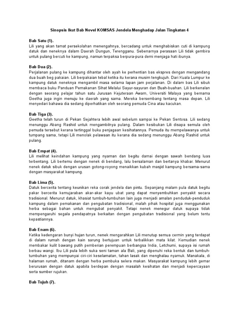 Komsas tingkatan 4 komponen sastera dan novel bm bahasa melayu. Sinopsis bab demi bab tema persoalan watak dan perwatakan latar masa latar tempat latar masyarakat plot teknik penceritaan gaya bahasa nilai pengajaran soalan peperiksaan skema jawapan contoh soalan jawapan novel jendela menghadap jalan k4. Novel jendela menghadap jalan tema tema novel ini ialah kehidupan masyarakat yang menghadapi pelbagai masalah diselesaikan dengan cara muafakat. Jendela menghadap jalan sinopsis.