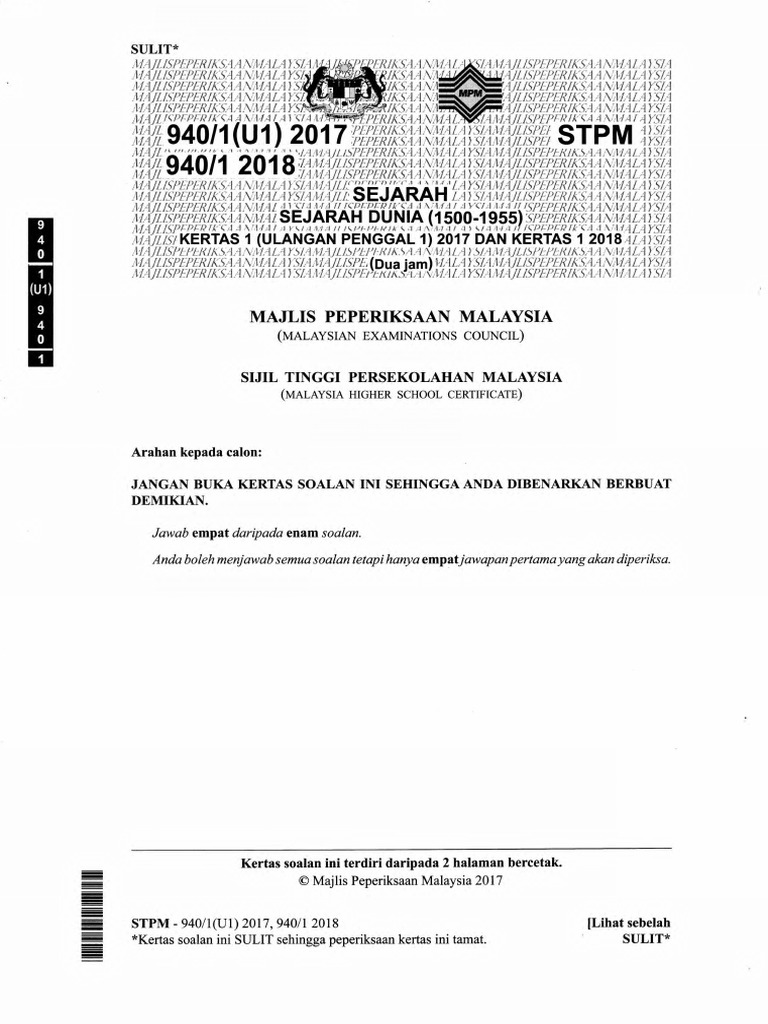 Sijil tinggi persekolahan malaysia. Browse by category. Soalan stpm sejarah penggal 1 2016 ada. Stpm disediakan oleh majlis peperiksaan malaysia mpm yang juga menyediakan.