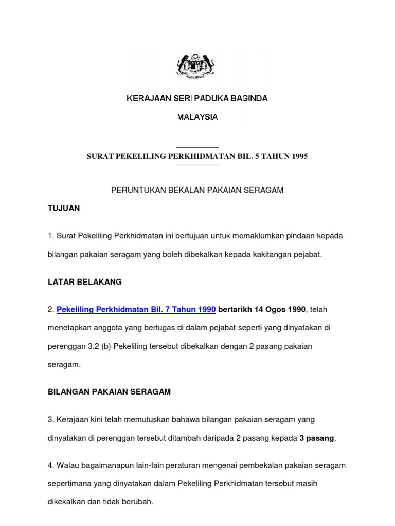 Pekeliling perkhidmatan bilangan 5 tahun 1995 author. 3 1 semua agensi hendaklah menguruskan bekalan pakaian seragam kepada pegawai masing masing pada setiap tahun.