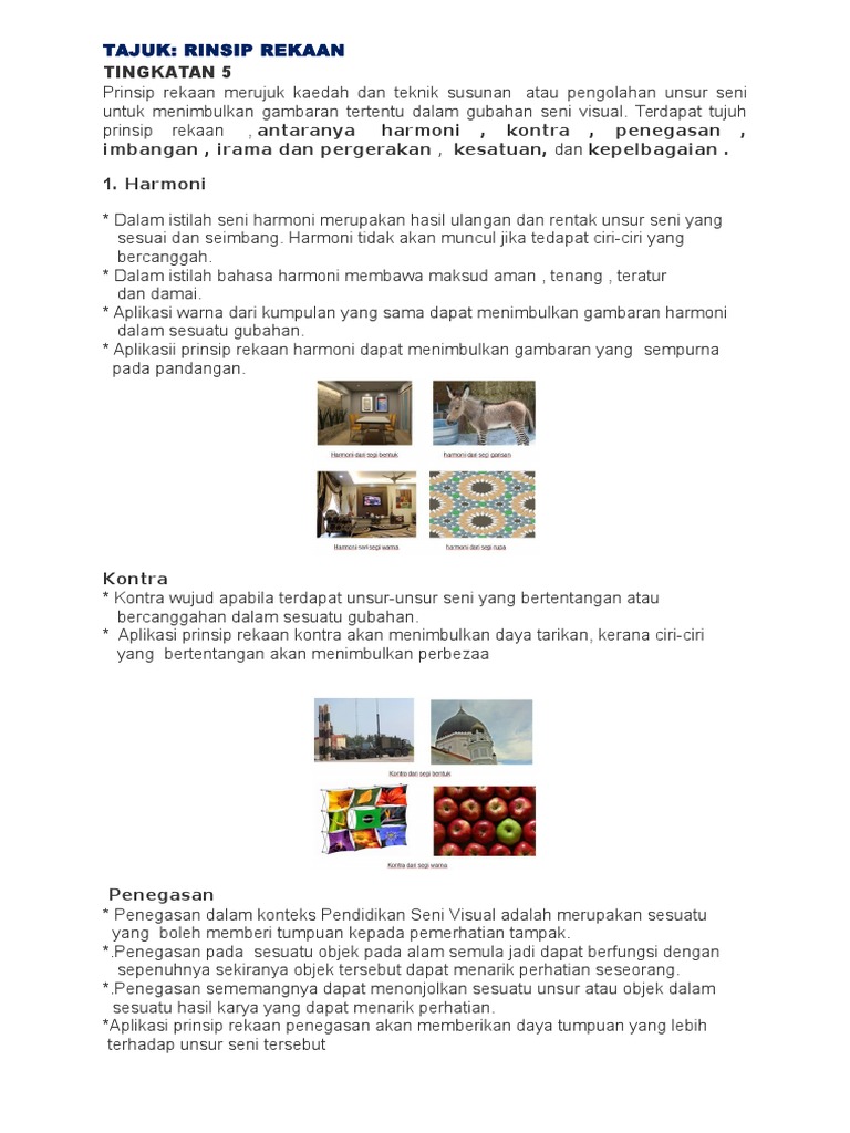 Harmoni dalam istilah bahasa harmoni membawa maksud aman dan damai dalam istilah seni harmoni merupakan hasil ulangan dan rentak unsur seni yang sesuai dan seimbang harmoni wujud dalam penggunaan. Prinsip rekaan terbahagi kepada tujuh iaitu salah satu prinsip rekaan ialah harmoni yang membawa maksud aman dan damai. Fungsi kontra ialah untuk menarik perhatian memberi fokus mengelakkan kebosanan dan kesan pergerakan kontra dapat dihasilkan melalui penggunaan unsur seni teknik dan bahan yang berlainan. Berdasarkan istilah seni harmoni merupakan hasil ulangan dan rentak unsur seni yang sesuai dan seimbang.