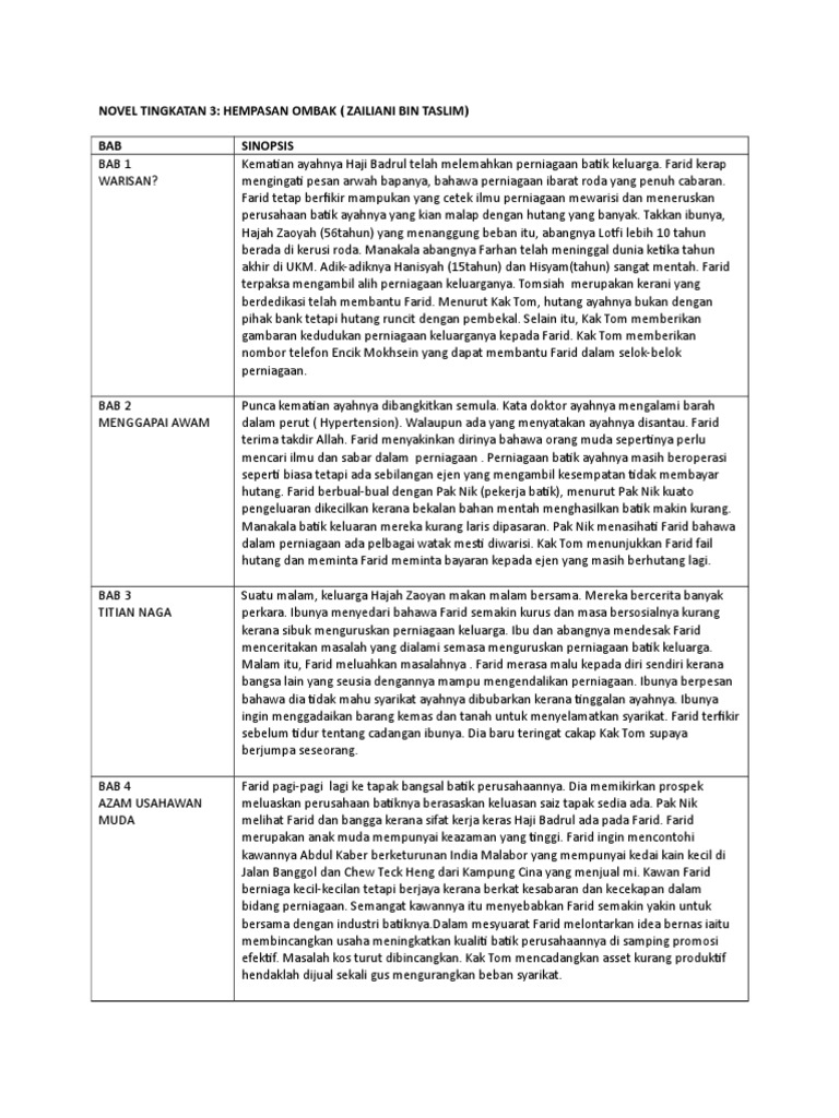 Hempasan ombak zailiani taslim novel ini mengisahkan seorang anak yang bernama farid meneruskan warisan syarikat perniagaan batik nusantara selepas ayahnya haji badrul meninggal dunia. Watak dan perwatakan novel tingkatan 3 watak dan perwatakan farid berusia 19 tahun dan bertubuh sederhana. Tema novel ialah kegigihan remaja dalam usaha untuk memajukan syarikat. Sinopsis bab 1 2 3 novel tingkatan 3 zailiani taslim sinopsis bab 1 kematian ayahnya haji badrul tel.